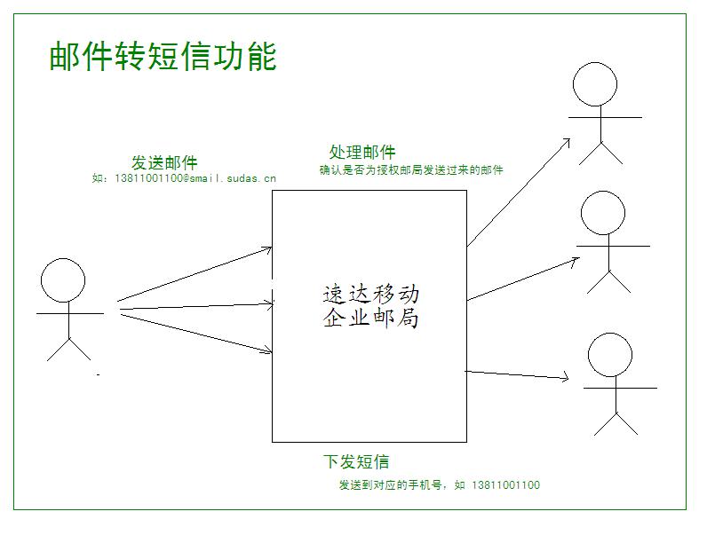 通过给速达移动邮件转短信功能邮局发送邮件,该邮局会判断是否是来自授权的邮局地址发送过来,且手机号码为邮箱前缀,邮局会自动通过106短信平台下发邮件正文作为短信内容到绑定的手机号。从而实现邮件转短信功能。