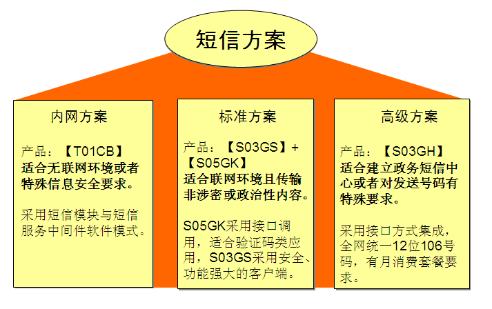 政务移动应用短信平台可以使用无线通信平台中间件或叫短信服务器;或者采用业务程序接口来实现。按照产品的不同特点与适应场景,分成内网方案、标准方案与高级方案。